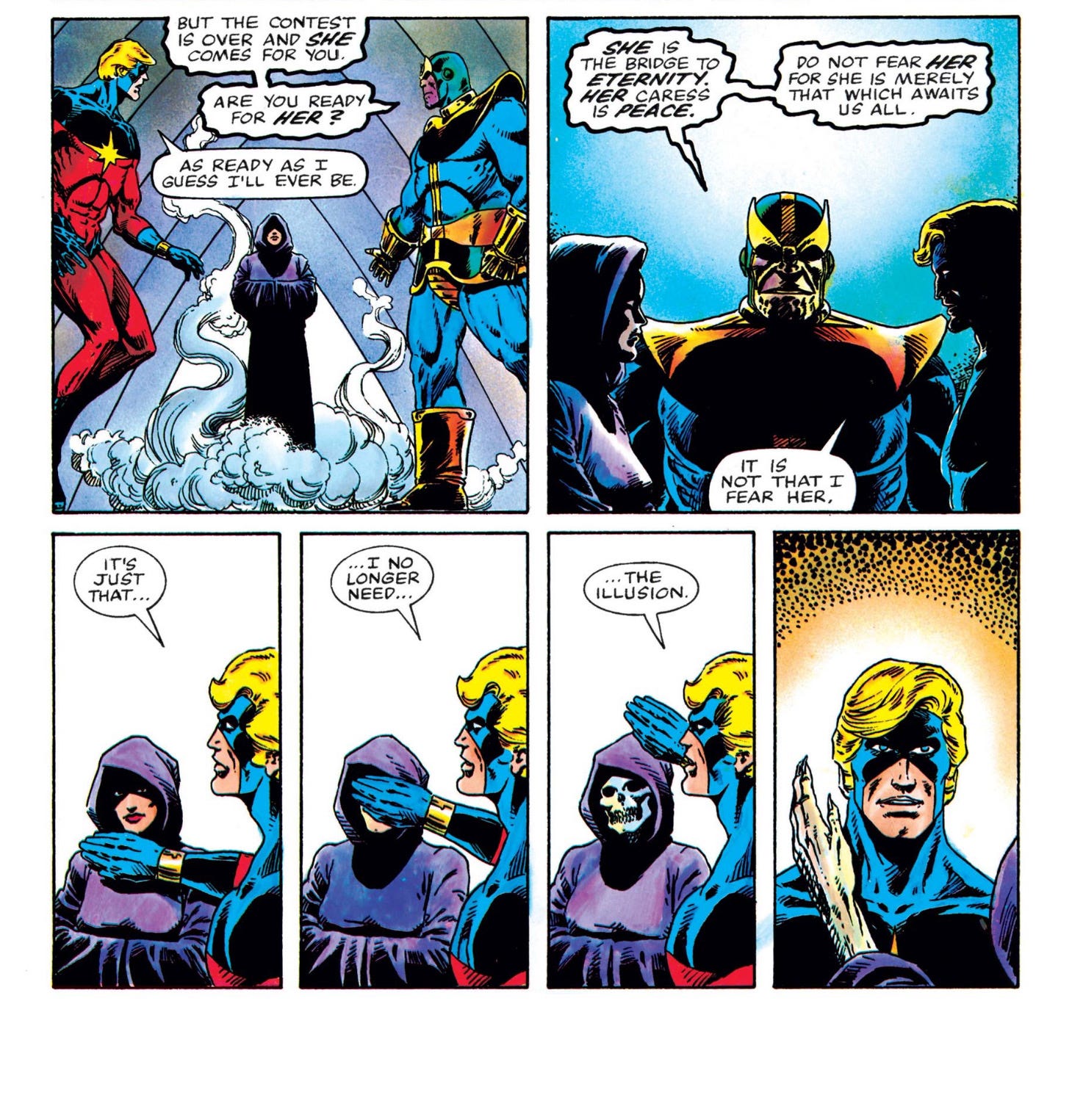 All I have are easy griefs but I need to let them go. Being real with myself, assessing what I can and what I want to do. Make decisions with what I can control. I think of Jim Starlin’s 1982 epic, Death of Captain Marvel and how Mar-Vell told Thanos he no longer needed “the illusion” when he was accepting his death. I accepted my death a long time ago. Life: continuing, persevering, restarting… letting go of what “should’ve been” and embracing what is. I tell myself I need no illusions but I don’t know if it’s true. Potential is perpetual, almost is forever. I’ll be damned if I died grieving a life I should’ve been living. No fear, no fear, no fear.